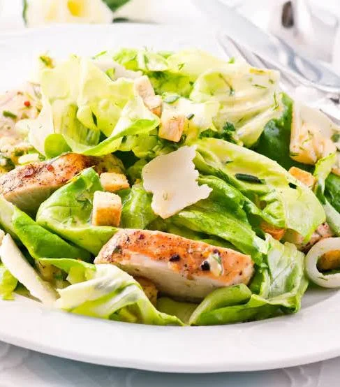 Iceberg, Poulet, œuf, tomate, oignons rouges, sauce César, croûton.